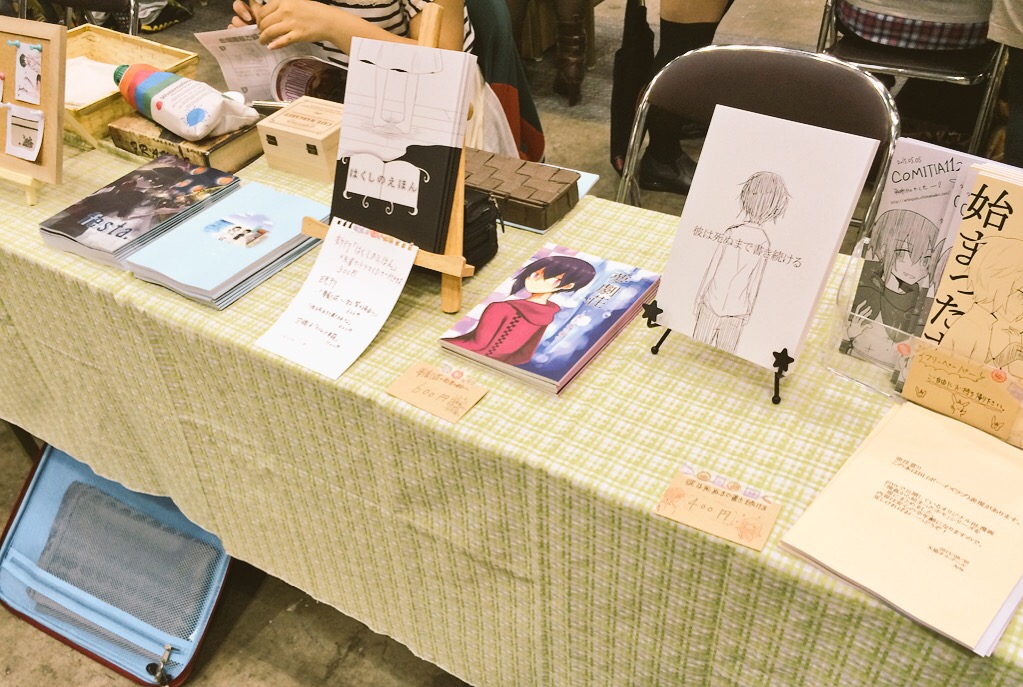 スペースはこんな感じです。お隣は柤野ハコベさんの「普遍的人間」で、真ん中にででーんと合同誌をおいてます。